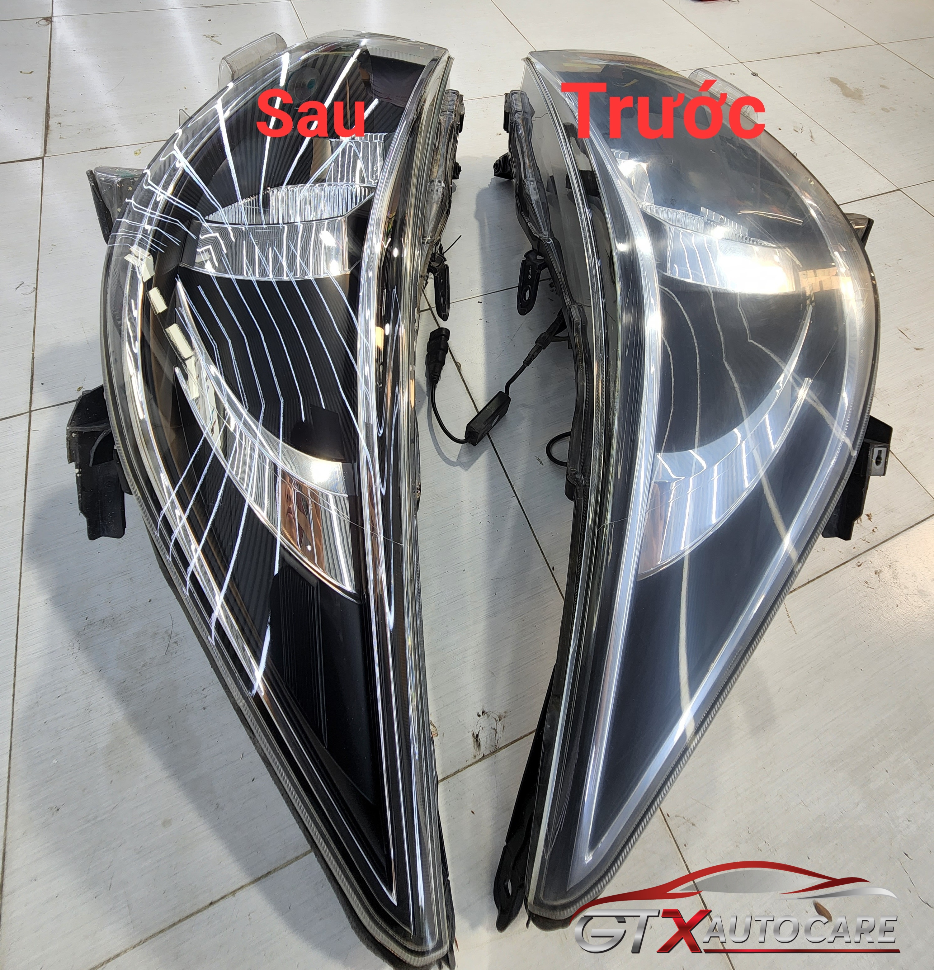Với kĩ thuật tay nghề cao và thiết bị chuyên dụng hiện đại. Đội ngũ thợ GTX Auto Care sẽ dùng nhiều phương pháp để xả bề mặt xước của kính, đèn pha. Làm cho bề mặt vết xước phẳng lại, không còn vết lằn trên kính, pha đèn. Rồi tiến hành phục hồi bề mặt, làm bóng trở lại bằng quy trình 4 bước phớt phục hồi, tăng bóng. Đưa kính trở lại hiện trạng ban đầu như mới.
